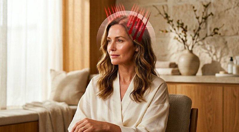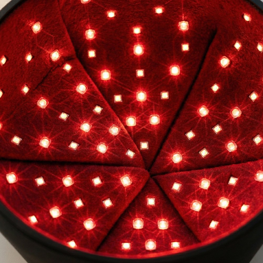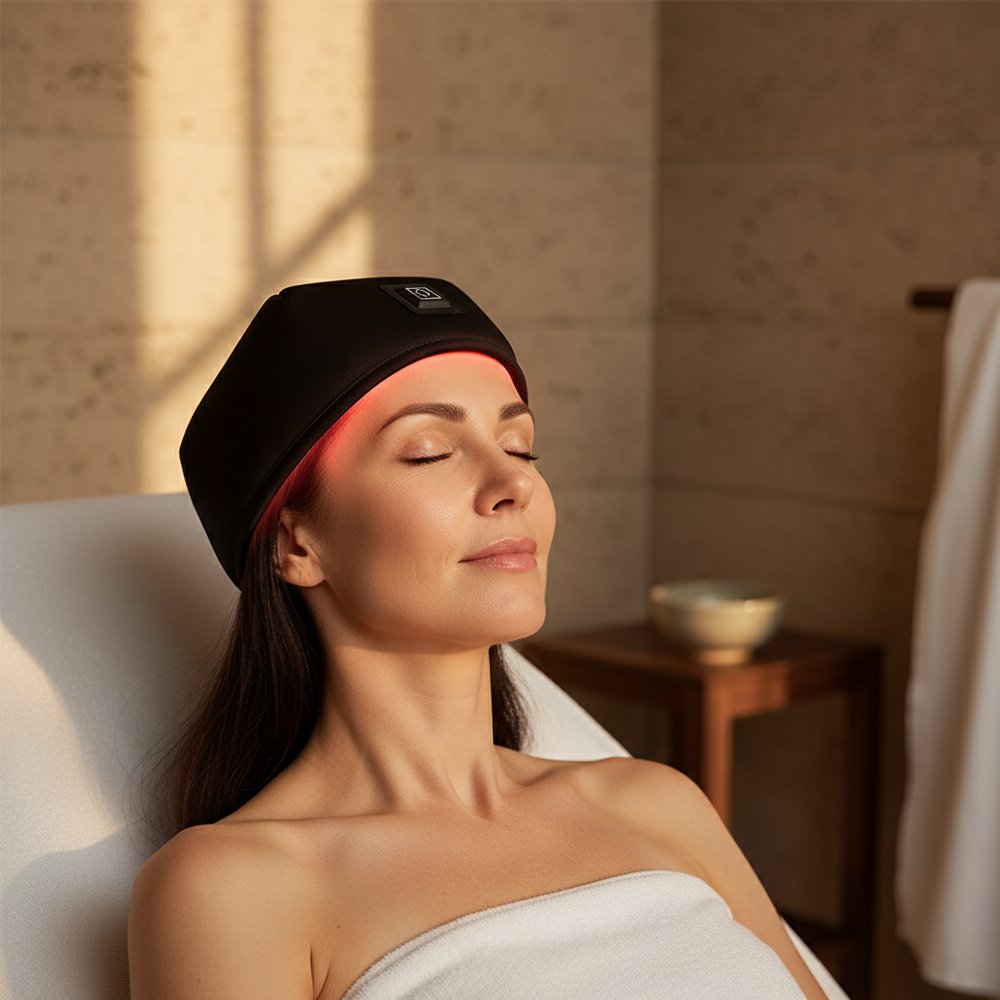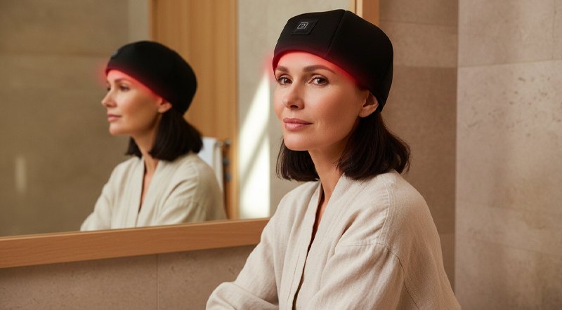 La lumière relance la circulation au sommet et sur la raie, les cheveux poussent plus forts et le volume tient mieux.
