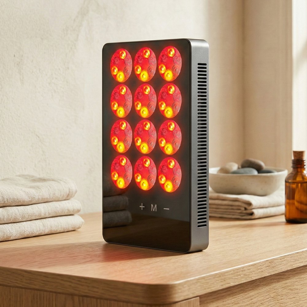 Le panneau combine plusieurs couleurs de LED (bleu, jaune, ambre, rouge et proche infrarouge) pour créer un spectre inspiré de la photobiomodulation en cabine. Vous en profitez dès que vous lancez une séance face au panneau, sur le visage, le cou, le décolleté ou le dos. Ce spectre multi couleurs agit à la fois sur l’éclat, l’uniformité visuelle et le confort de la peau. Il différencie un vrai soin lumière d’une simple lampe colorée et rend les effets sur teint terne et traits fatigués plus crédibles.
