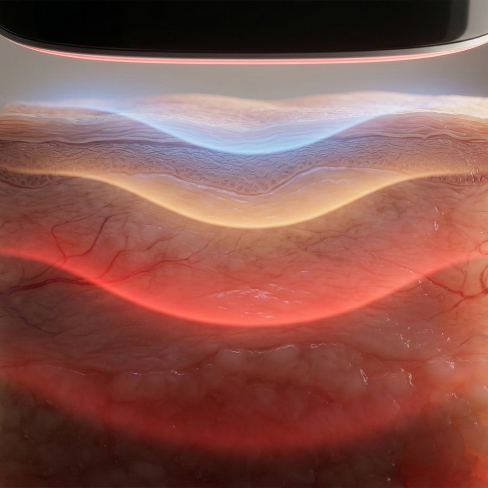 La lumière ambre aide à raviver l’éclat et à atténuer les irrégularités du teint, tandis que la lumière bleue contribue à rééquilibrer les peaux sujettes aux imperfections.